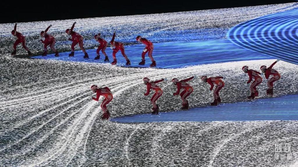 开幕式上,滑冰运动员滑过冰面后,留下长长的轨迹。(总台国广记者李晋拍摄)