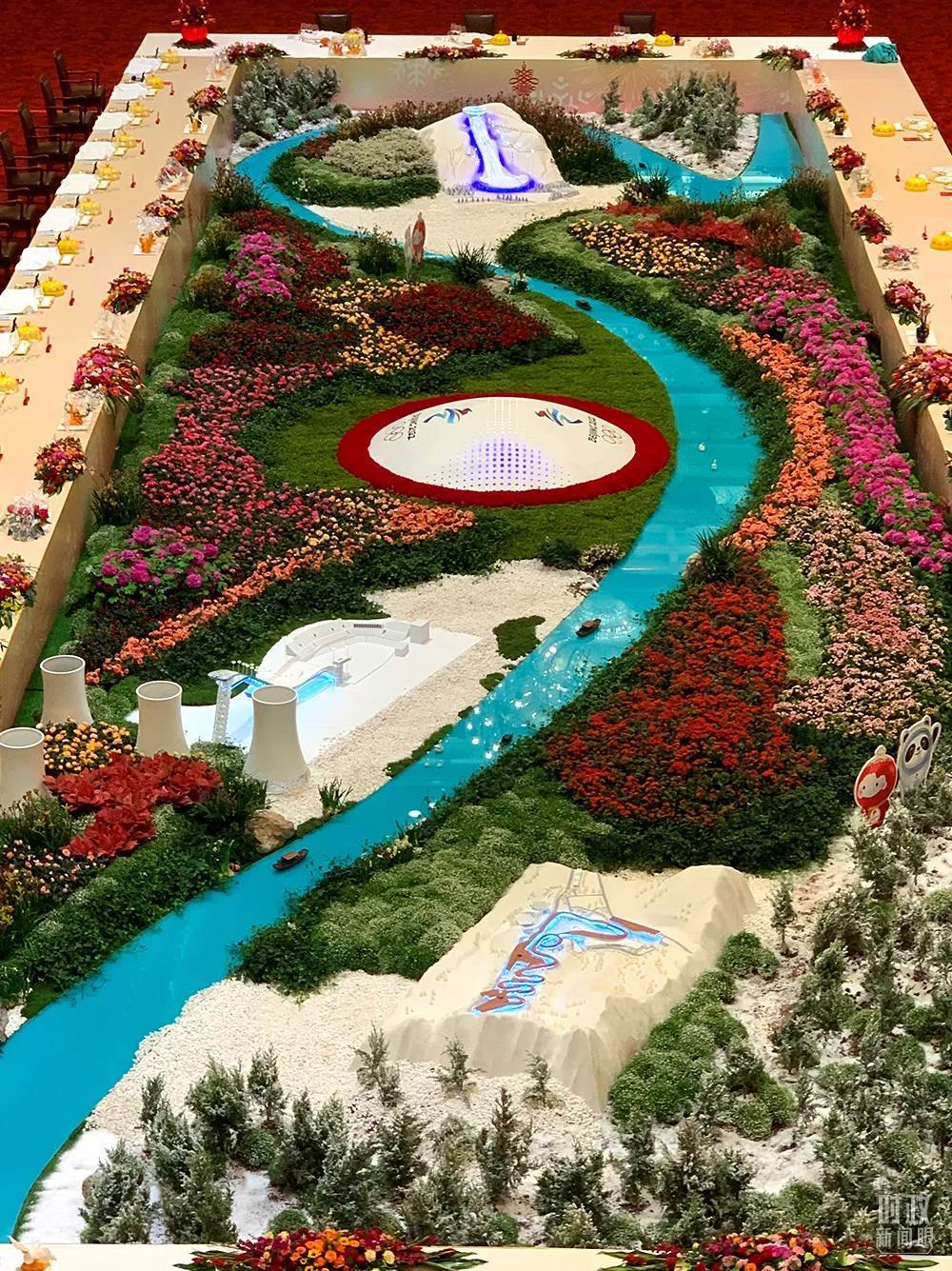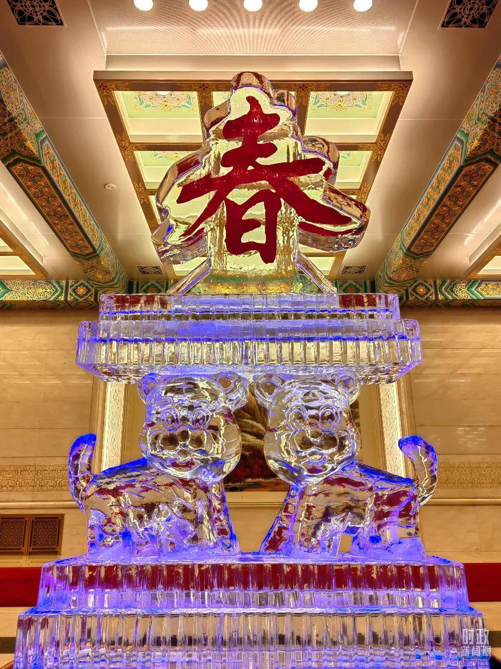 宴会厅摆放的“春”主题冰雕。(总台央视记者钟锋拍摄)