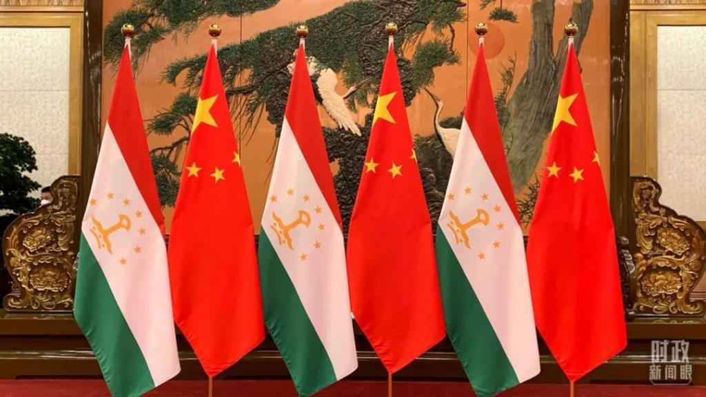 塔吉克斯坦国旗与五星红旗。(总台央视记者段德文拍摄)