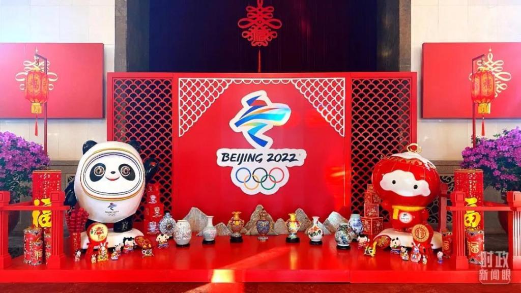 北京冬奥会、冬残奥会吉祥物亮相大会堂。(总台央视记者张宇拍摄)