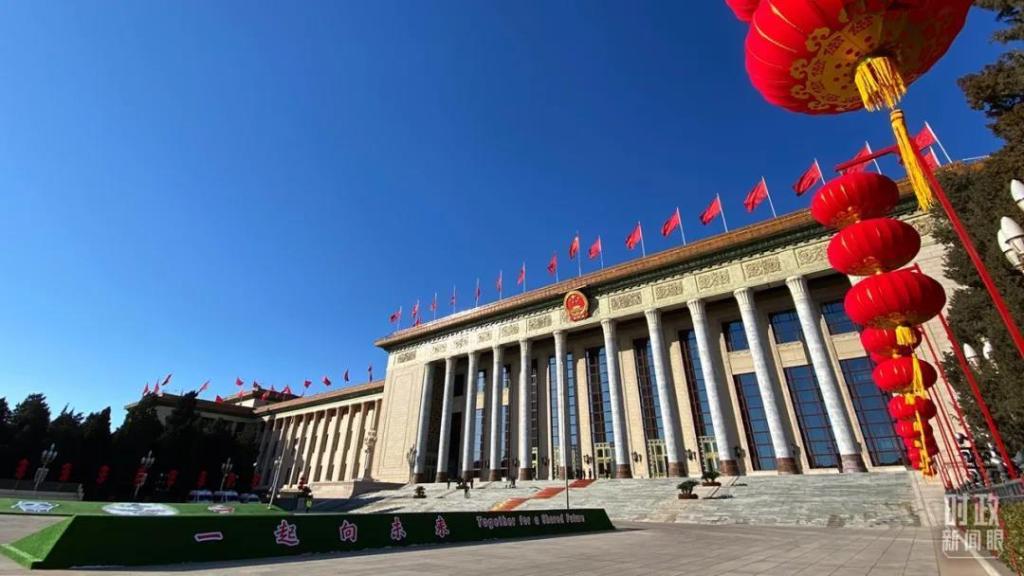 人民大会堂外,为迎接冬奥新设计的“一起向未来”字样格外醒目。(总台央视记者石奇用拍摄)