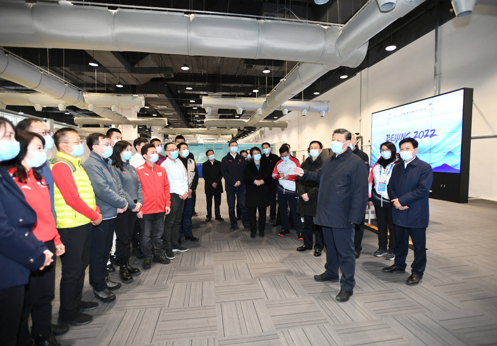 2022年1月4日,中共中央总书记、国家主席、中央军委主席习近平在北京冬奥会、冬残奥会主媒体中心媒体工作间,同正在做准备的国内媒体记者代表亲切交流。新华社记者 谢环驰 摄