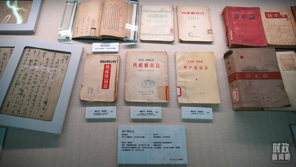 图书馆内,《共产党宣言》多个译本展示。(中央广播电视总台央广记者潘毅拍摄)