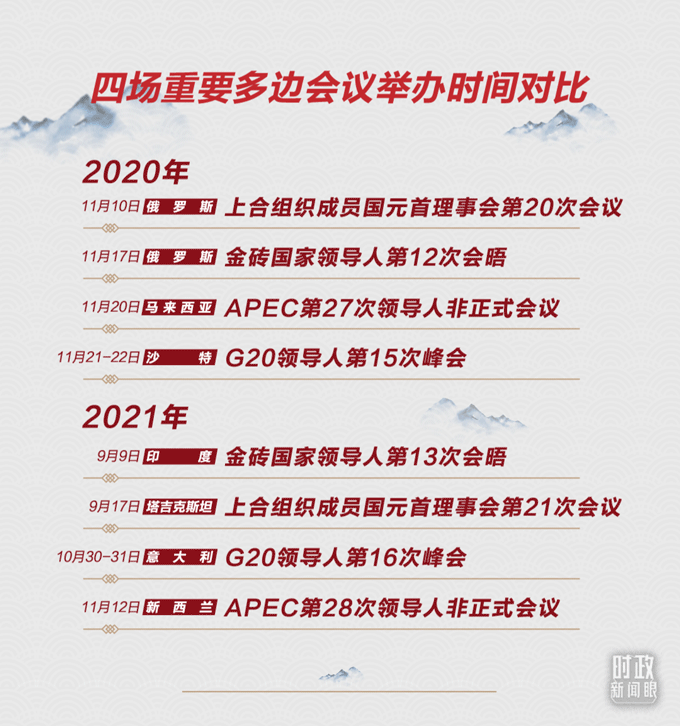 新冠肺炎疫情的暴发,给多边峰会带来不小的影响。去年,上合、金砖、APEC、G20这四场多边峰会“扎堆”在11月份举行,因此也被称为“峰会月”。今年情况有所好转,系列峰会出现了向正常会期回归的迹象。
