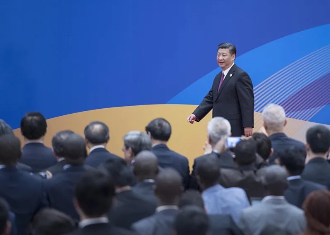 2017年5月15日,“一带一路”国际合作高峰论坛在北京雁栖湖国际会议中心举行圆桌峰会,习近平主持会议并致辞。圆桌峰会闭幕后,习近平会见中外记者,介绍“一带一路”国际合作高峰论坛会议情况和主要成果。图为习近平步入记者会现场。新华社记者 李涛摄