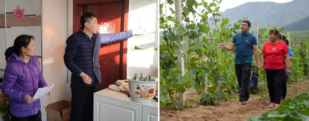 拼版照片。左图为内蒙古赤峰市喀喇沁旗马鞍山村驻村第一书记孙伟在村民家走访;右图为原驻村第一书记刘叶阳在查看山葡萄种植基地。(图片为受访对象提供)